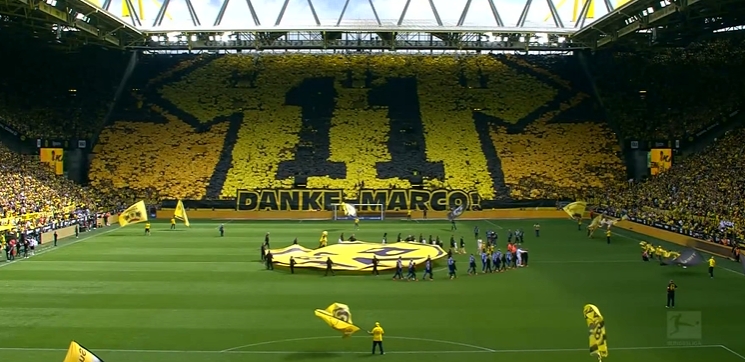第82分钟,多特换下队长罗伊斯,多特球员列队告别罗伊斯,这位球员最后一次为多特出战德甲联赛,全场球迷也起立为他送上掌声。↓