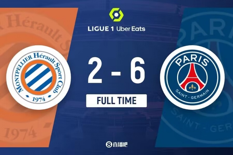 下半场伤停补时4分钟,全场比赛结束,最终巴黎圣日耳曼6-2蒙彼利埃。