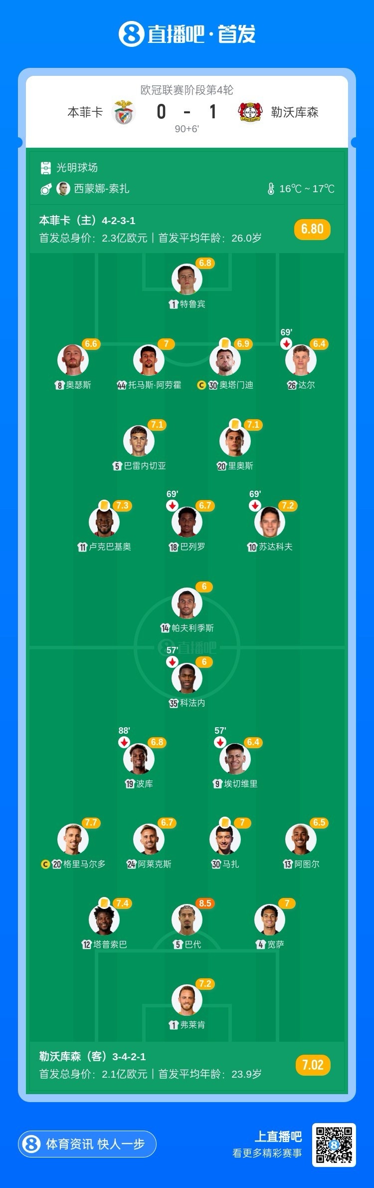 4连败!本菲卡0-1勒沃库森 希克制胜球奥塔门迪、卢克巴基奥中框