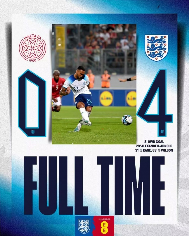 欧预赛-阿诺德世界波萨卡造乌龙凯恩点射 英格兰4-0马耳他三连胜