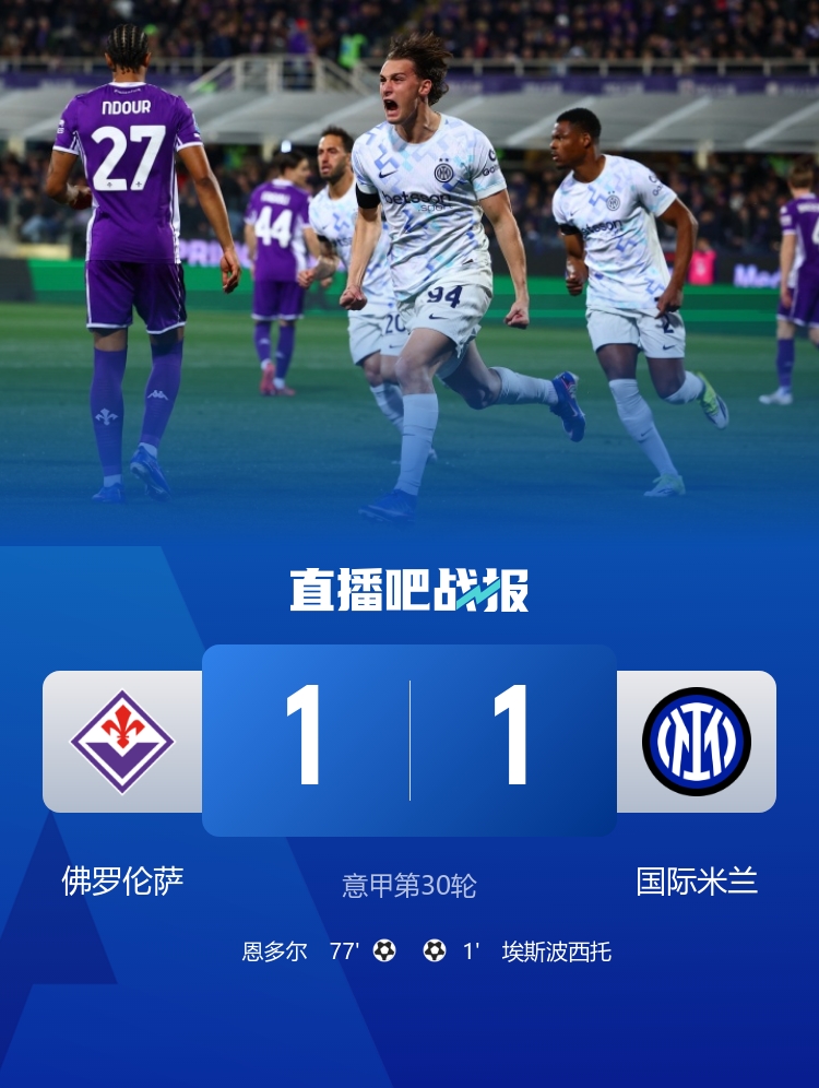 下半场补时4分钟。最终全场比赛结束,佛罗伦萨1-1国米。