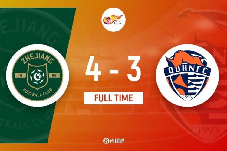 伤停补时10分钟。全场比赛结束,浙江4-3青岛海牛。