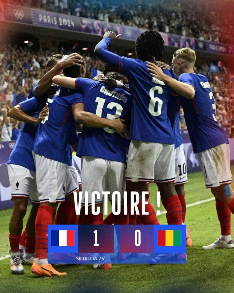 7月28日讯 北京时间7月28日凌晨三时,奥运男足小组赛A组第二轮,法国队对阵几内亚。上半场,法国队控球占优,但制造的机会不如几内亚多,马特塔单刀被扑,尾声阶段和补射阶段,凯塔和图雷的进球都因越位在先被吹。半场战罢,法国队暂0-0几内亚;下半场,卡里姆恩多射门中柱,奥利斯助攻西尔迪西亚头球到僵局。全场比赛结束,法国队1-0几内亚!