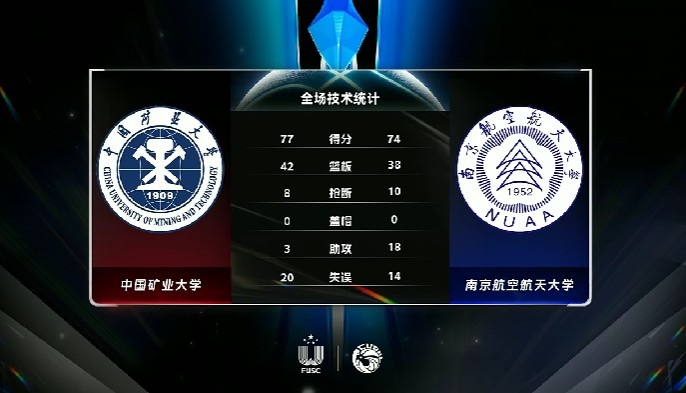 末节比赛,陈斯睿在突破时滑到,她与陈诺都出现了受伤的情况,回到比赛后中国矿大的进攻出现问题,南京航空将分差缩小到仅剩2分,关键时刻张雨柔两罚中一,陈诺绝平三分不中,最终中国矿大77-74险胜南京航空。