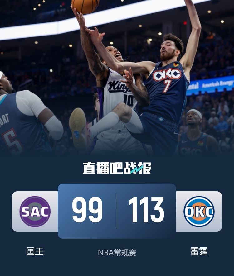 比赛开始,双方开场便陷入缠斗,比分交替领先,亚历山大连投带罚拿分,威少传射建功带队追赶,次节雷霆轮番冲击内线频频得手,国王多点开花还以颜色,切特高效输出,施罗德里突外投迅速回应,雷霆一波6-0以58-50领先结束上半场。易边再战,切特先中三分将分差拉开到两位数,此后两队围绕10分分差展开拉锯战,亚历山大延续火力,国王不断冲击努力追赶,末节多特突然发力,内外开花连续拿分帮助球队保持优势,国王大势已去无力回天。最终,雷霆113-99击败国王,主场过关。
