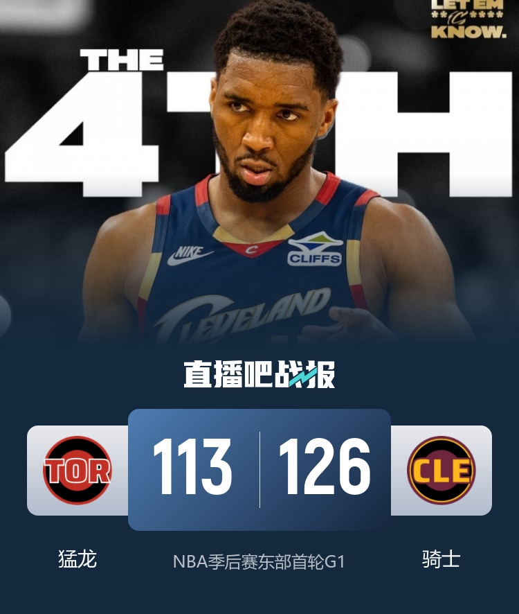 比赛开始,两队开场便陷入缠斗,巴恩斯和英格拉姆高效输出,哈登传射建功带队回应,斯特鲁斯持续输出,米切尔攻防两端发力帮助骑士占据主动,次节两队依旧打得难解难分,哈登和斯特鲁斯相继飙中三分,半场战罢骑士61-54领先猛龙。易边再战,莫布里内外开花,斯特鲁斯连中三分个人打出8-0的攻击波率队获20分以上优势,猛龙连续获得10次罚球迅速迫近比分,米切尔连投带罚稳住局势,末节双方围绕20分的分差展开拉锯战,骑士稳扎稳打保持优势,猛龙大势已去无力回天。最终,骑士126-113击败猛龙,取得1-0的领先。
