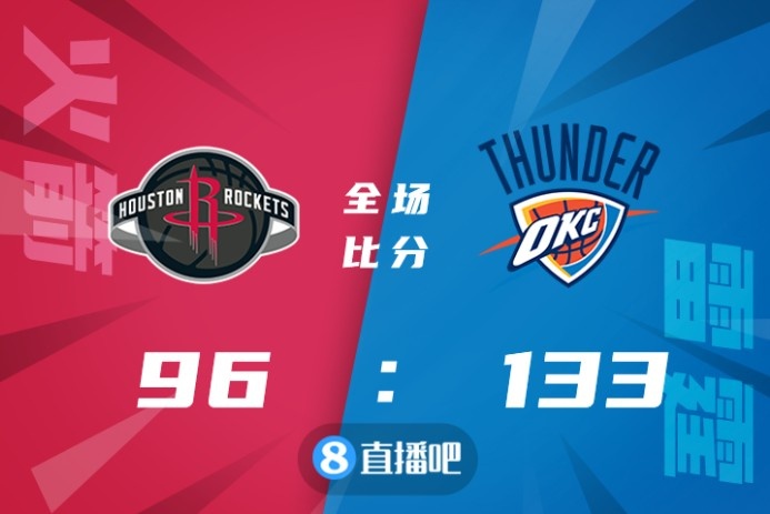 比赛开始,雷霆火力全开,攻防两端完全压制,很快取得两位数领先,火箭全队梦游,雷霆轻松将分差拉开到20分以上,杰伦-格林拿分唤醒球队进攻,但半场战罢火箭还是以54-76落后22分。易边再战,火箭再度断电,雷霆多点开花单节爆砍40分将分差拉开到40分。过大的分差让比赛早早失去悬念,最终,火箭96-133惨败雷霆,吞下7连败。