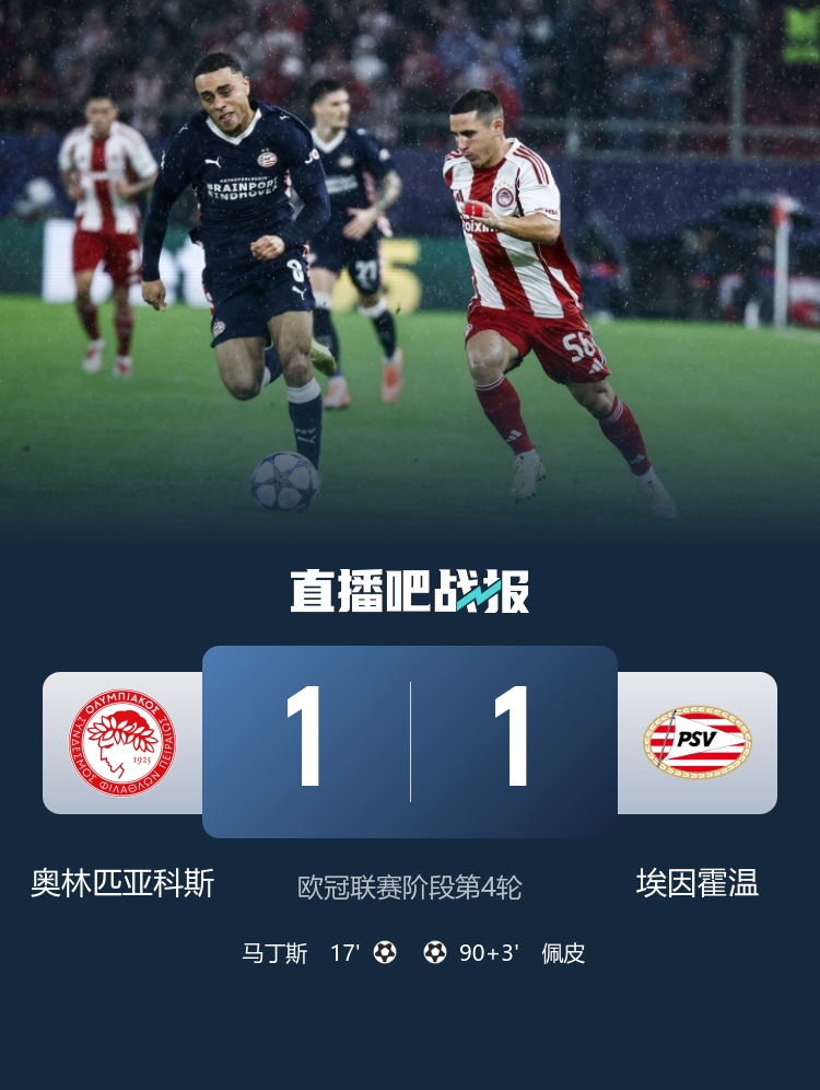 下半场补时4分钟,奥林匹亚科斯1-1埃因霍温。