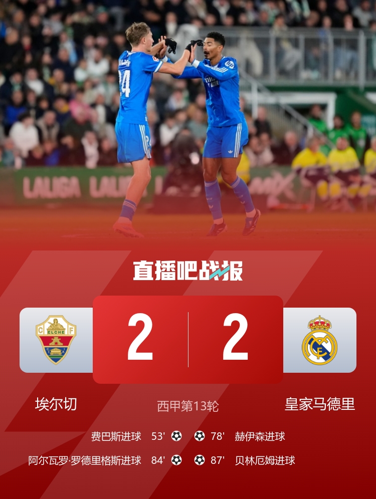优势只剩1分!皇马2-2埃尔切两连平 贝林厄姆传射赫伊森首球