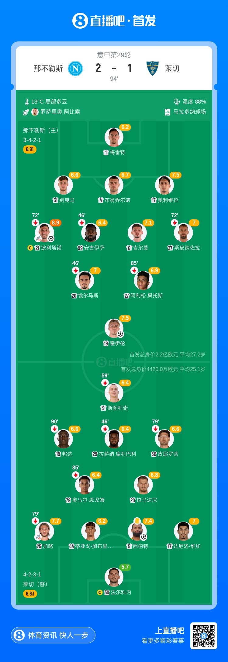 第67分钟,那不勒斯左侧角球,德布劳内开到禁区内,莱切球员冒顶,禁区内后点波利塔诺凌空破门完成传射!那不勒斯2-1反超莱切↓
