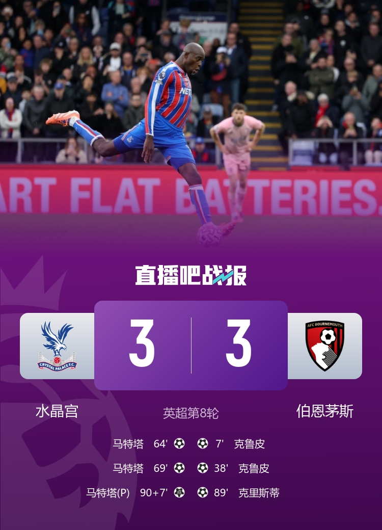 遭点球绝平!伯恩茅斯3-3水晶宫7轮不败 马特塔戴帽+错失绝杀