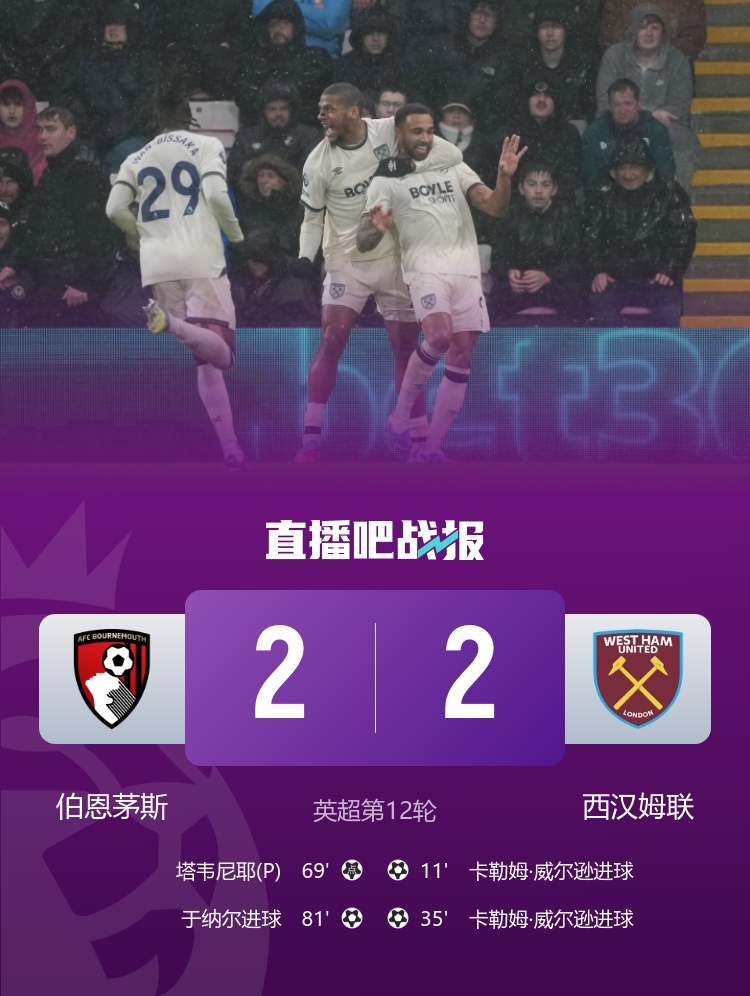 11月23日讯 北京时间11月22日23时,英超第12轮,伯恩茅斯坐镇活力球场迎战西汉姆联。上半场,威尔逊连入两球上演梅开二度!半场战罢,伯恩茅斯暂2-0西汉姆联;下半场,基尔曼手球送点,塔维尼耶点射破门,于纳尔替补破门扳平比分,阿雷奥拉屡献神扑!全场比赛结束,伯恩茅斯2-2西汉姆联!