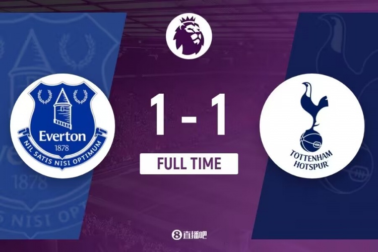 全场比赛结束,热刺1-1埃弗顿。