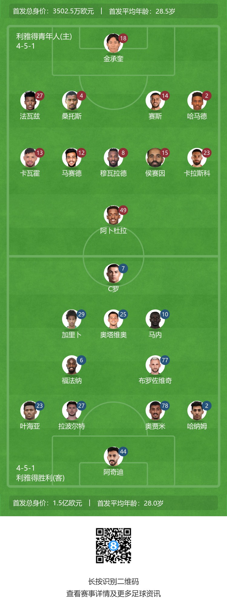 第28分钟,利雅得青年人开出,卡瓦霍在禁区内高高跃起将球打进!利雅得青年人1-1扳平利雅得胜利↓
