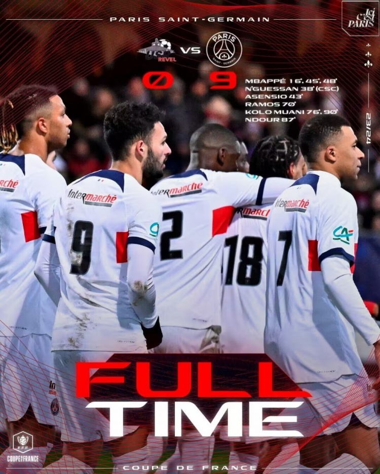 1月8日讯 北京时间1月8日凌晨3:45,法国杯1/32决赛,巴黎圣日尔曼对阵US勒韦勒。上半场姆巴佩双响,阿森西奥传射,索莱尔两助攻,穆基勒造成对手乌龙,巴黎圣日尔曼暂4-0US勒韦勒;下半场阿森西奥助攻姆巴佩破门,贡萨洛-拉莫斯造点随后自己罚中,穆阿尼双响,恩杜尔破门,最终巴黎圣日尔曼9-0US勒韦勒,晋级下一轮。