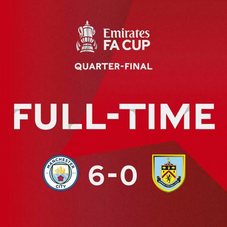 足总杯-哈兰德连场戴帽小蜘蛛2射1传丁丁2助 曼城6-0伯恩利进四强