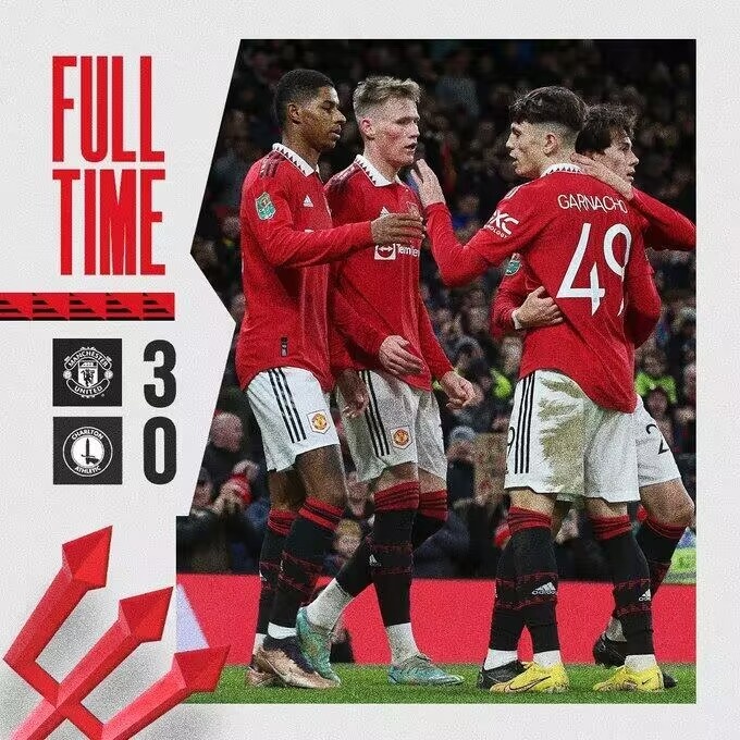 1月11日讯 北京时间1月11日04:00,英格兰联赛杯四分之一决赛曼联主场迎战查尔顿的比赛,上半场安东尼远射世界波破僵,弗雷德中柱,下半场拉什福德替补双响,最终曼联3-0查尔顿成功晋级四强。