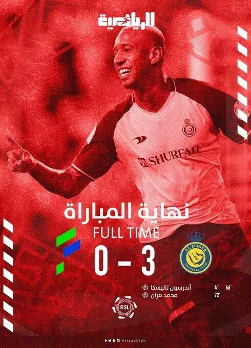 沙特联-塔利斯卡双响C罗缺阵 利雅得胜利3-0哈萨征服联赛第二收官